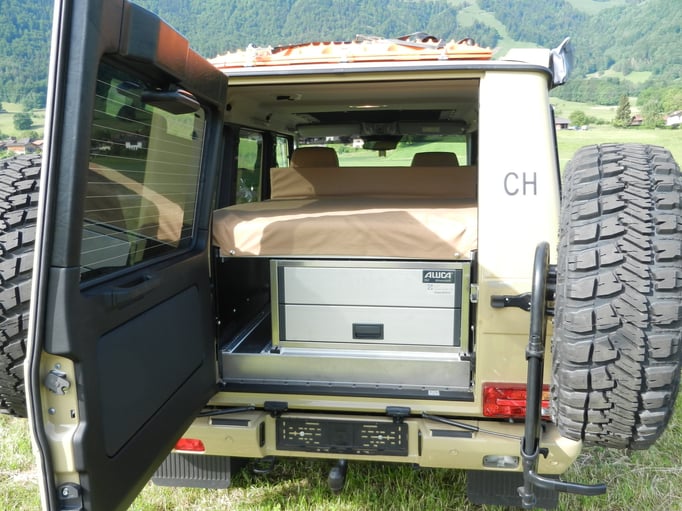 Auf einen Dachträger wurde verzichtet. Die Fahrzeugeinrichtung mit Schubladenauszügen besteht ganz aus Aluminum.